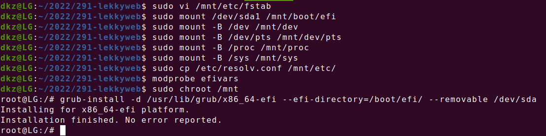The remaining steps will show how to fix this, as well as how to correctly install a working GRUB bootloader onto our newly created /dev/sdb1 system fat32 ESP partition.